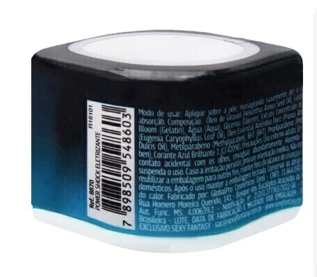 Óleo de Girassol, Gelatina 180 Bloom, Água, Glicerina, Extrato Concentrado de Jambu, Óleo Essencial Amêndoa Doce, Metilparabeno, BHT, Propilparabeno, Corante Azul Brilhante 1